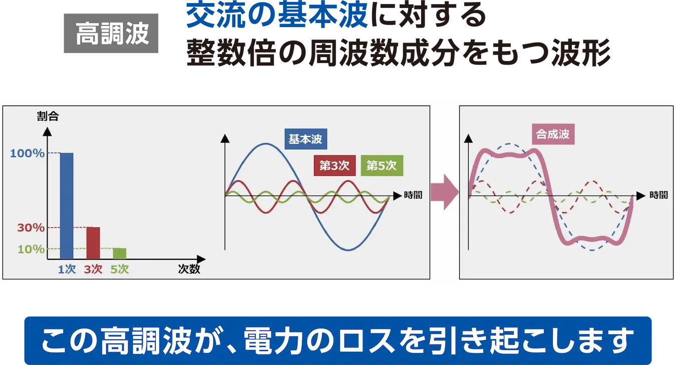 電流の波形が歪むことで生じる成分です。高調波が多い環境では、余分な電流が流れやすくなり、発熱やロスが発生しやすい場合があります。