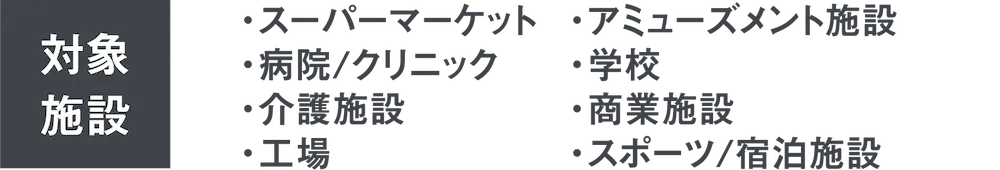 導入施設例:介護施設 / 宿泊施設 / 商業施設 / 工場